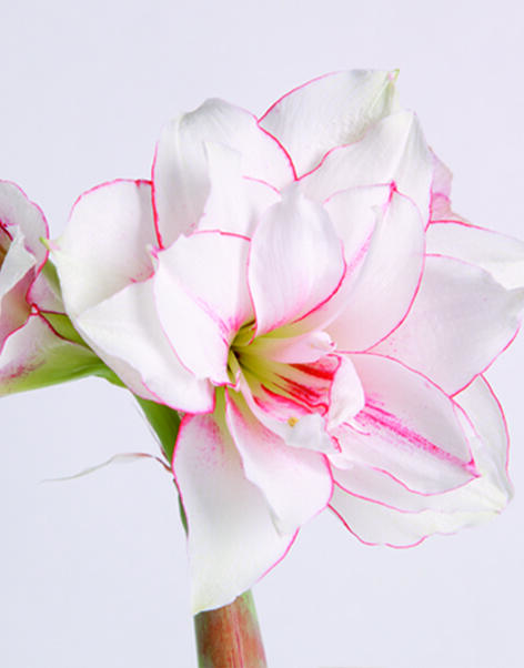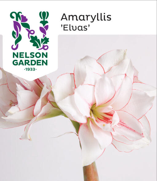 Elvas on hämmästyttävän kaunis amaryllislajike. Sen kukat ovat suuret ja kerrotut, pääväri on valkoinen koristeltuna mausteisen kirsikanpunaisilla reunuksilla ja raidoilla. Tämä kaunotar levittää iloa kotiin.
