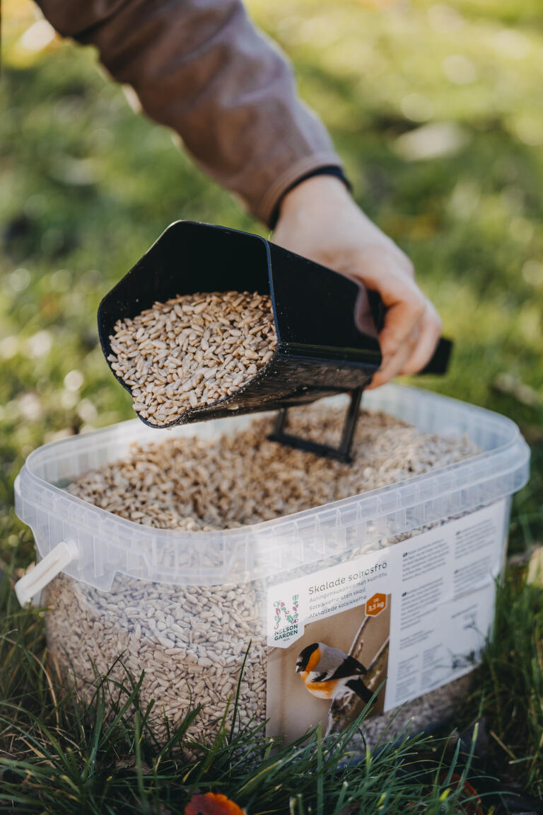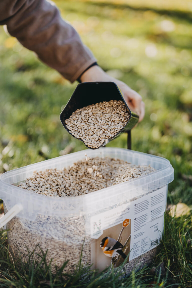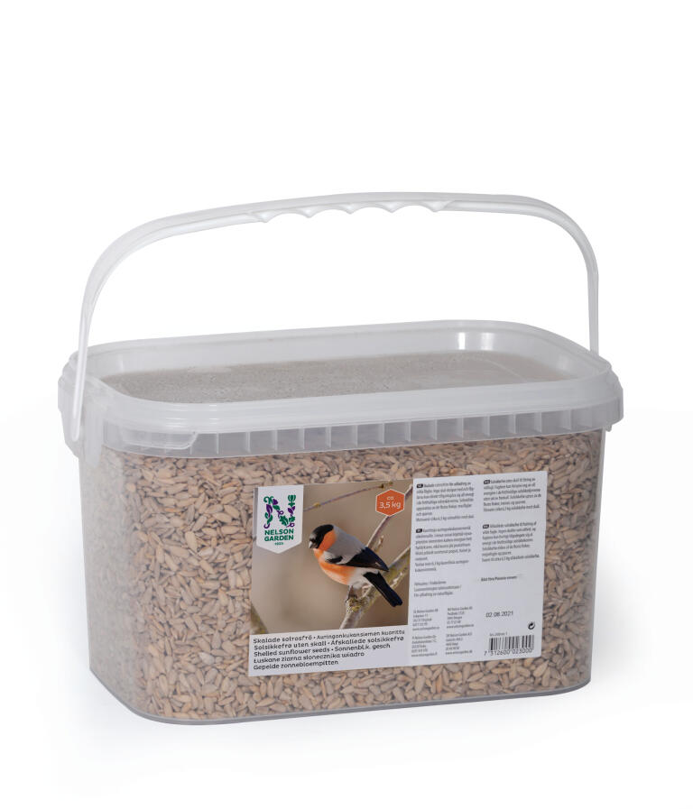 Kuorittuja auringonkukansiemeniä. Linnut voivat käyttää kaiken energian heti hyödykseen, eikä kuoria jää parvekkeelle tai puutarhaan. Vähentää myös jyrsijäongelmaa. Sanko