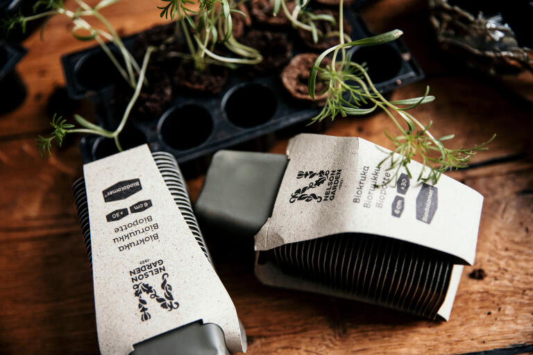 Hajoava kylvöruukku. Valmistettu kalsiumkarbonaatista, sokeriruo'osta ja rapsinsiemenistä (biohajoavista PBAT- ja PBS-muoveista). Voidaan kompostoida käytön jälkeen.
