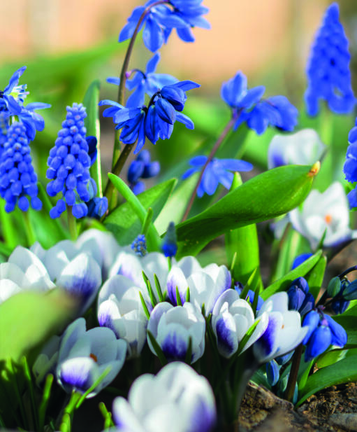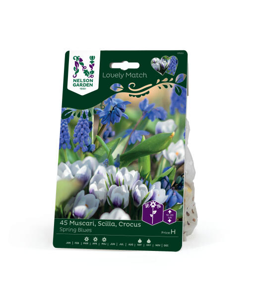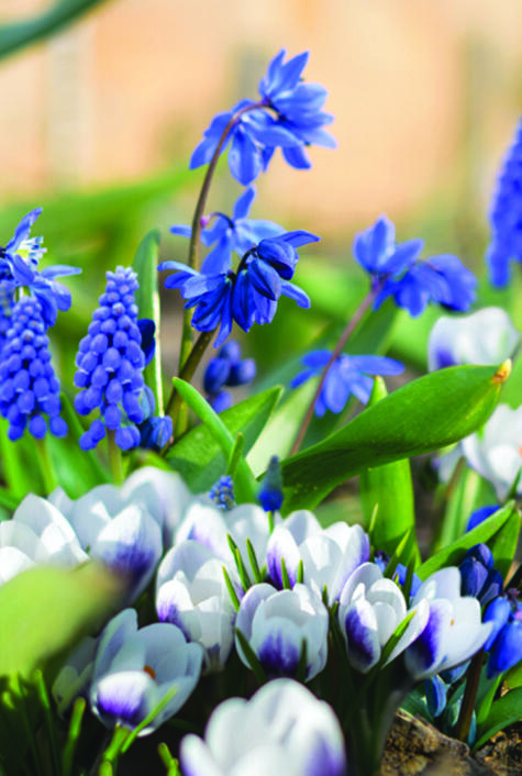Uljas helmihyasintti, säkkäräinen idänsinililja ja pyöreänmuotoinen sinisahrami. Näistä teet soman keväisen kimpun; sinistä, valkoista ja hitunen violettia. Sopii kukkapenkin reunaan, koriin ja ruukkuun, mutta myös pieneen maljakkoon.