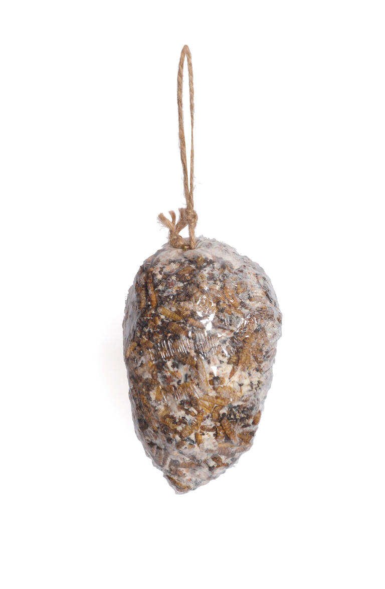 Koristeellinen käpy, joka on täytetty talilla, runsaasti öljyä sisältävillä siemenillä, maissilla sekä proteiinipitoisilla mustan sotilaskärpäsen toukilla. Erilainen, mutta hyvin energiapitoinen ruokalaji pikkulintujen buffet-pöytään.