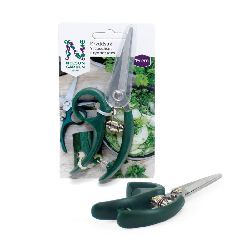 Pienet ja kätevät yrttisakset. Keittiömausteet on helppo leikata saksien pitkillä terillä ja etusormi sopii kädensijaan erinomaisesti. Pit. 15 cm.