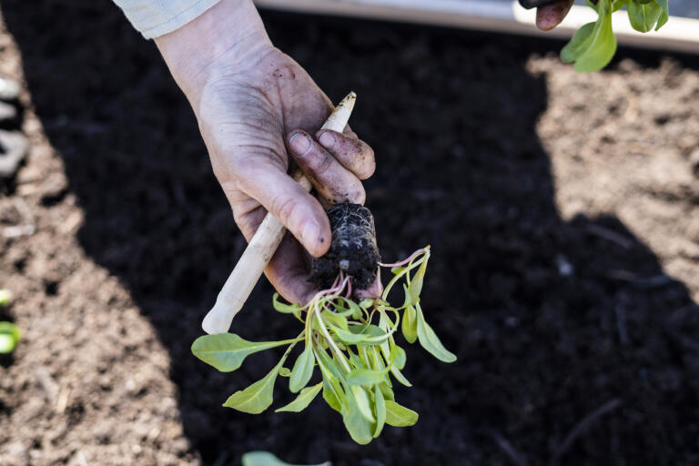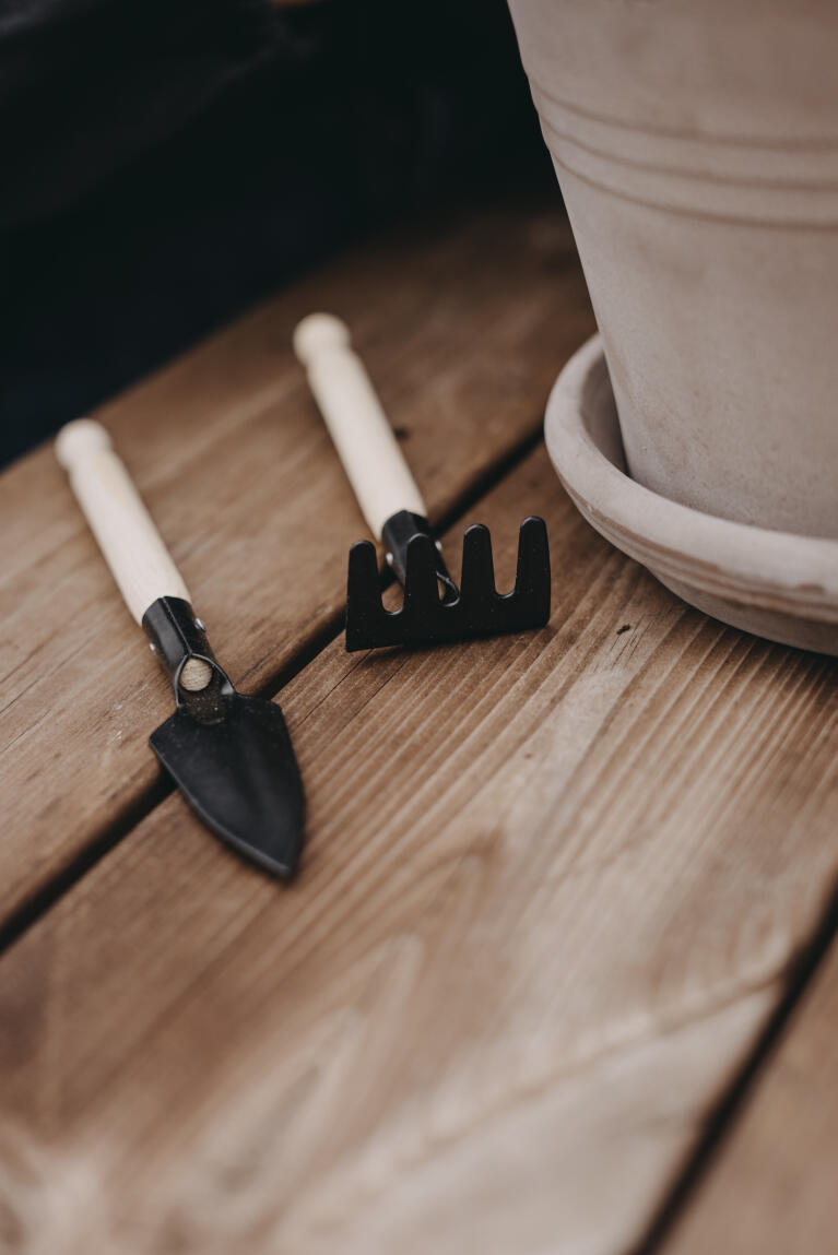 Hieno koulintasetti, joka sisältää minilapion, ja -haran sekä istutuspuikon.
