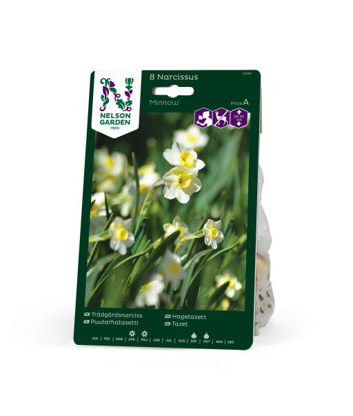 'Minnow' on puutarhatasetti. Joka varressa on kaksi tai useampia kukkia. Kukat ovat pienet ja tuoksuvat. Yläterälehdet vaaleankeltaiset ja lisäkruunu tummankeltainen. Sievä kukkapenkissä ja ruukussa. Lajike ei juuri maistu kauriille, jäniksille, kaneille ja myyrille.