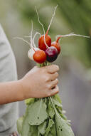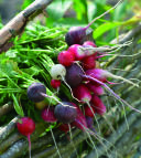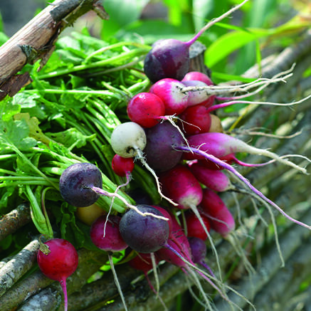 Sekoitus vaaleanpunaisia, keltaisia ja valkoisia retiisejä. Korjaa satoa vähitellen. Kylvä retiisiä muutaman viikon välein, niin saatavilla on aina tuoretta satoa. Peitä kasvuharsolla.