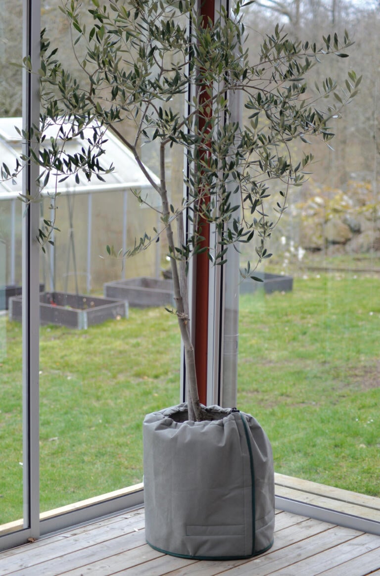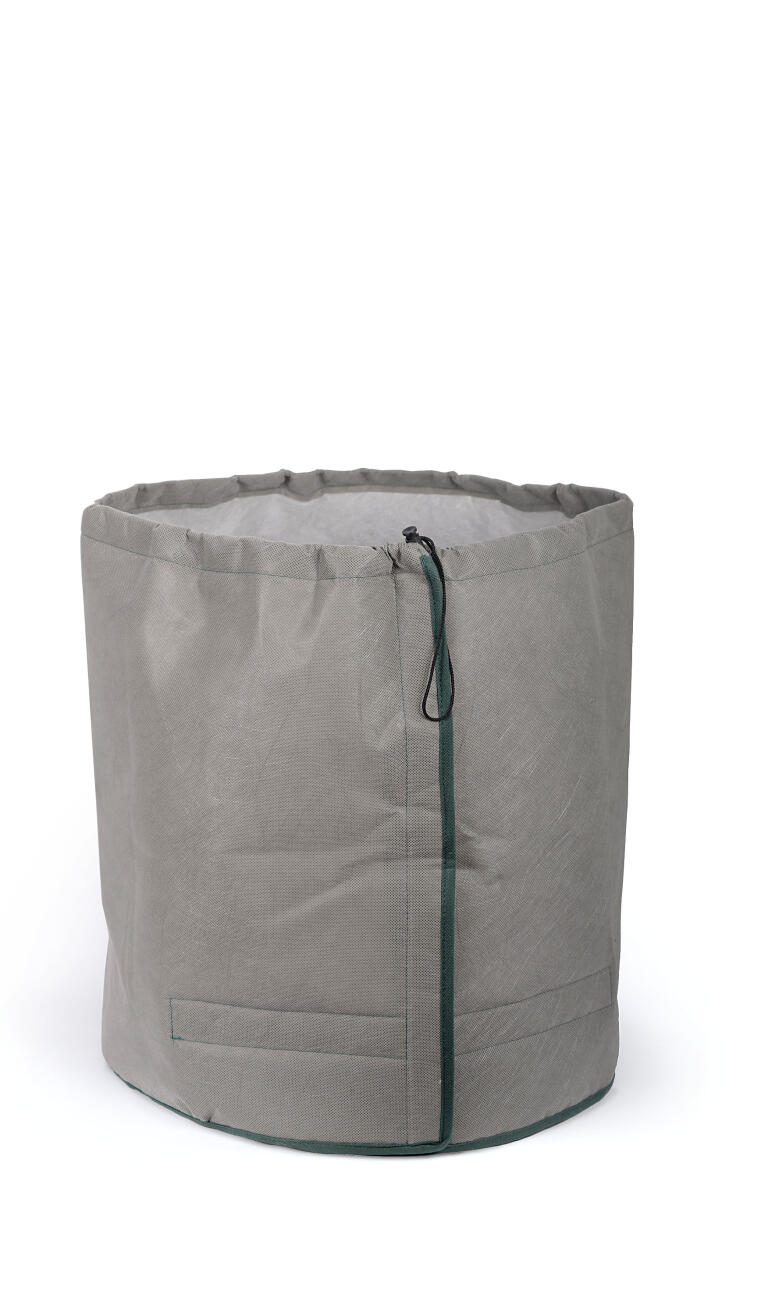 Eristävä ruukunsuoja esim. parvekkeella talvehtiville ruukkukasveille. Tarranauha ja nyörit. Kolme suojakerrosta polypropeenia (PP) 100g/m² ja 30g/m² sekä polyeteeniä (PE). 4cm paksu solumuovialusta. Kork. 50cm, Ø45 cm.