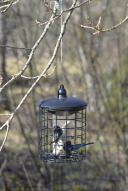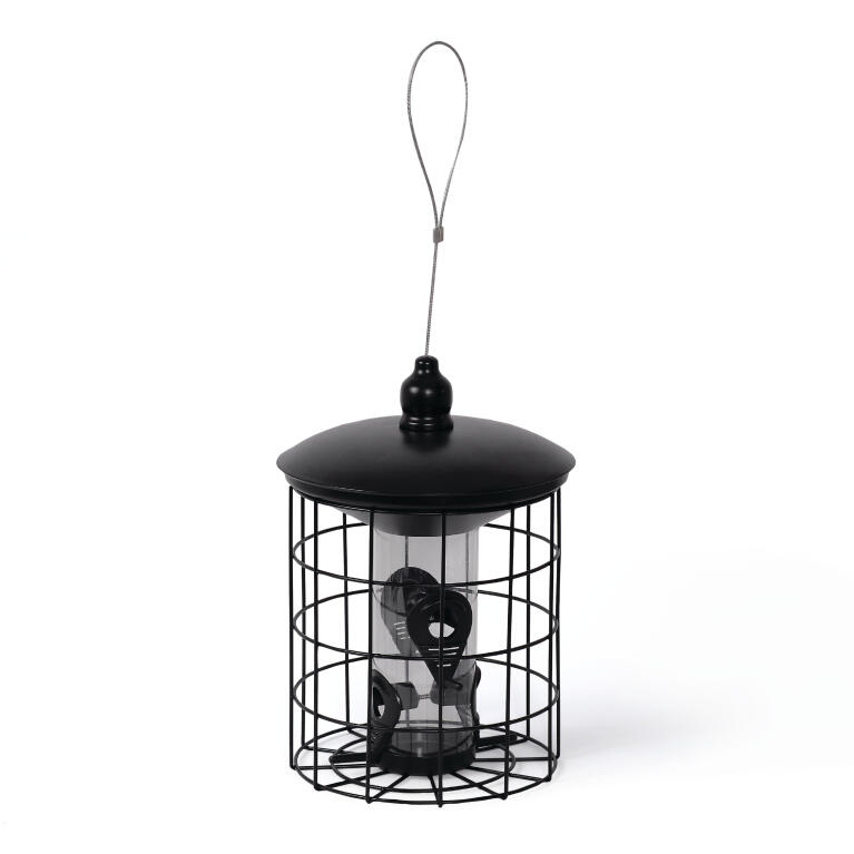 Siemenautomaatti, jonka suojaristikko pitää suuret linnut poissa. Täytetään helposti yläosassa olevan kannen kautta. Mukana vaijeri ja karbiinihaka. Mustaa metallia. Kork. 29cm Ø20cm