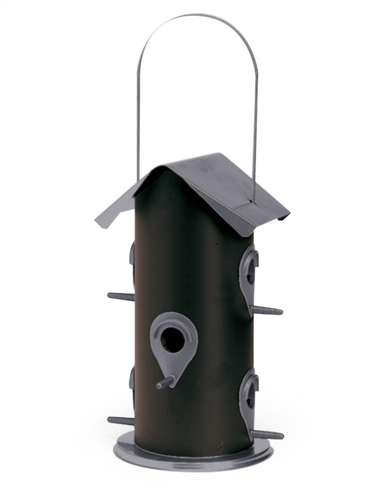 Suuri siemenautomaatti. Katto ja pohja harmaata, astia mustaa metallia. Kuusi ruokinta-aukkoa, joissa harmaa muoviorsi/metallia. Täytetään yläkautta. Tilavuus n.3 l. Ø 16x32cm.