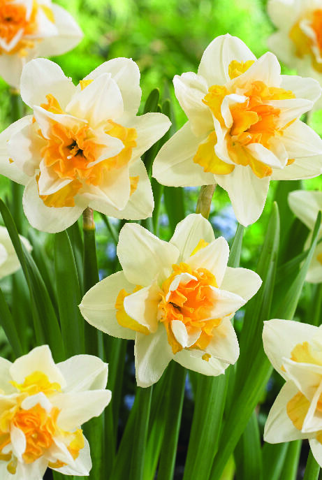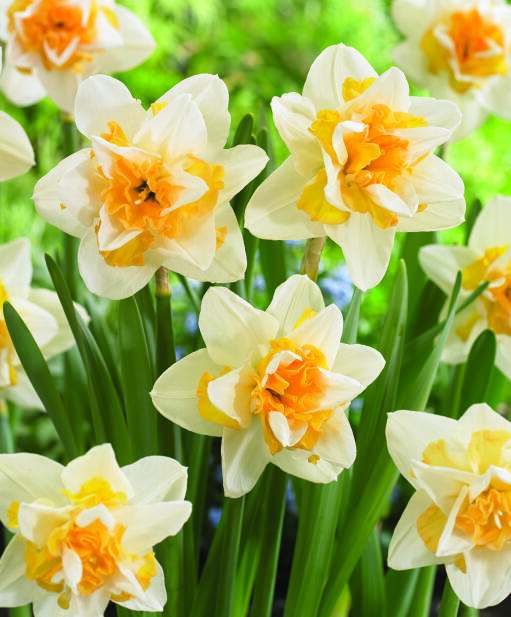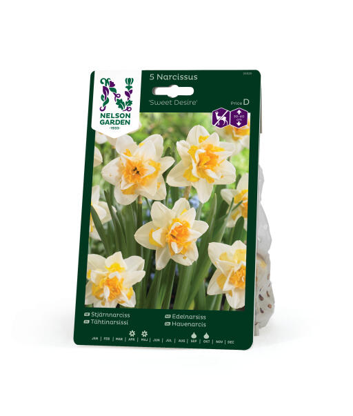 Kerrottu narsissi, jossa kermanvaaleat kehäliuskat ja kerrotussa kruunussa valkoista ja oranssinkeltaista kiehkuraa. Klassisia värejä, ylellistä tyyliä. Unelma kevään kukkapenkkiin. Lajike ei juuri maistu kauriille, jäniksille, kaneille ja myyrille.