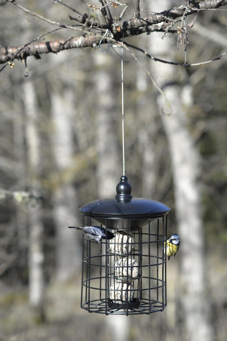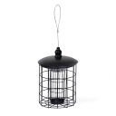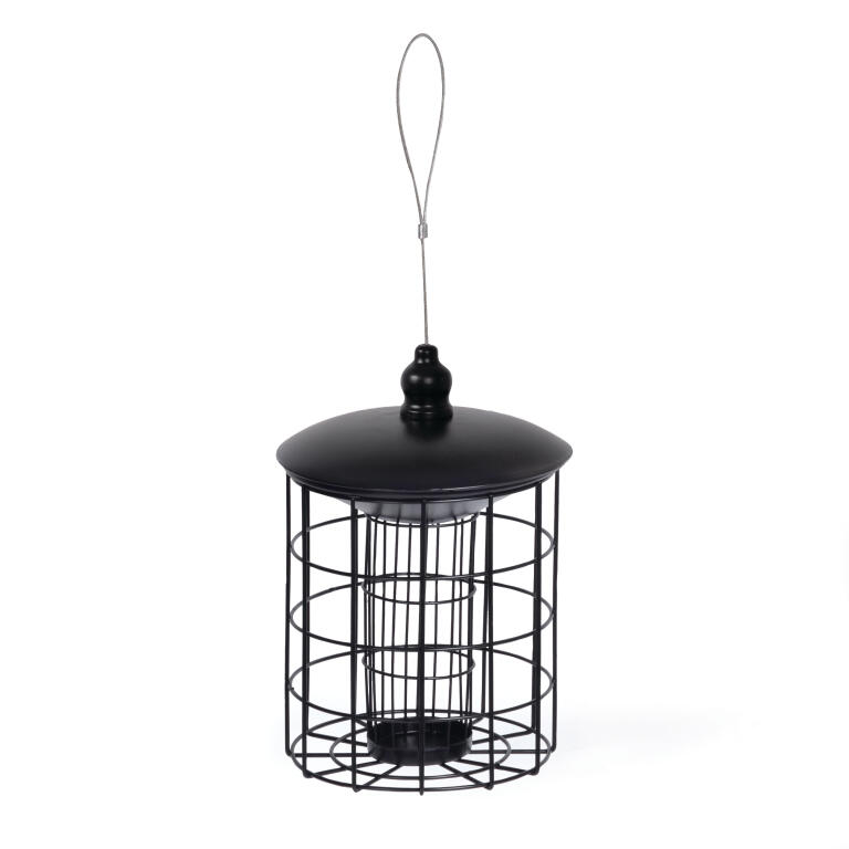Talipalloautomaatti, jonka suojaristikko pitää suuret linnut poissa. Täytetään kannen kautta. Mukana vaijeri ja karbiinihaka. Mustaa metallia. Kork. 29 cm, Ø 20cm