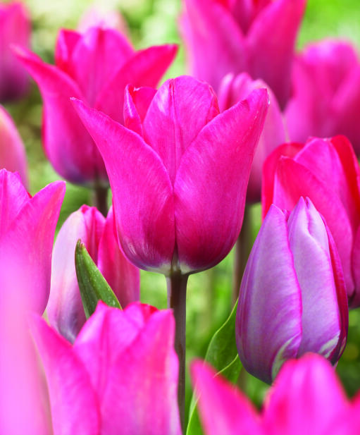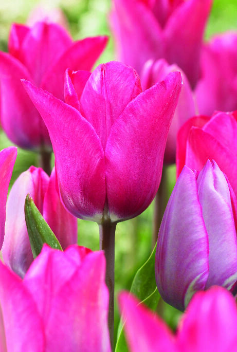 Tämä tulppaani on kukkapenkin katseenvangitsija, kukkakimpun väriläiskä. Vihreät nuput muuttuvat ensin hopeisen vaaleanpunaisiksi ja tummareunaisiksi, sitten suuret kukat aukeavat vaaleanpunaisen ja liilan sävyissä. Erityisen kauniit, tummat varret!