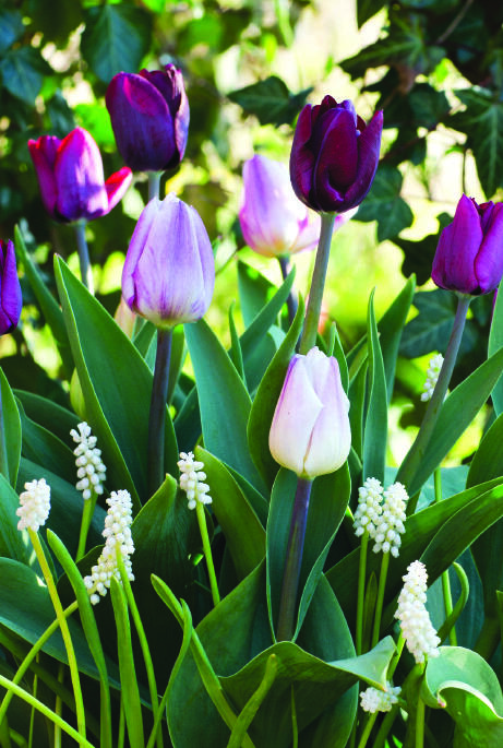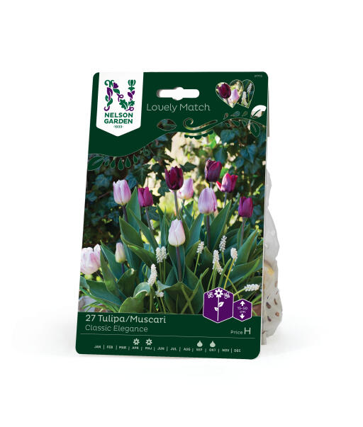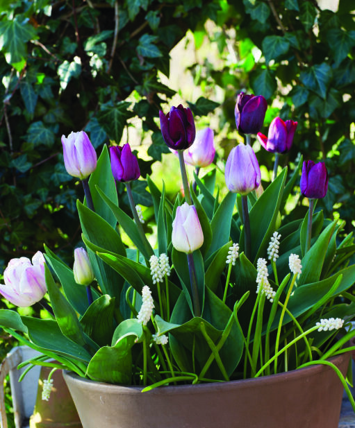 Tasapainoinen väriyhdistelmä vaimeaa viininpunaista, lilaroosaa ja puhdasta valkoista kukkapenkkiin tai ruukkuun. Klassinen tulppaanien muoto korostuu valkoisten helmihyasintin kukkien joukosta.