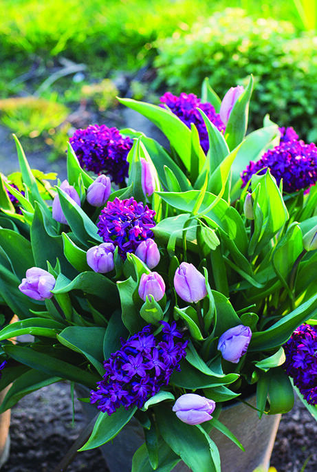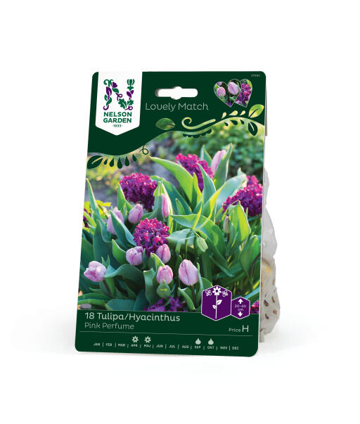 Lämminsävyinen sekoitus syvän purppuranpunaisia, tuoksuvia hyasintteja ja hempeän vaaleanliiloja tulppaaneja, joissa myös hieman hopeansävyä. Upea istutettuna ruukkuun. Sievä kukkapenkissä.