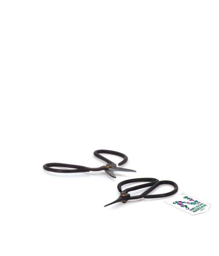 Kauniit bonsai-yrttisakset. Sirot ja käytännölliset yrttien keräämiseen tai ruukkukasvien siistimiseen. Mustaa metallia. Pituus 10cm.